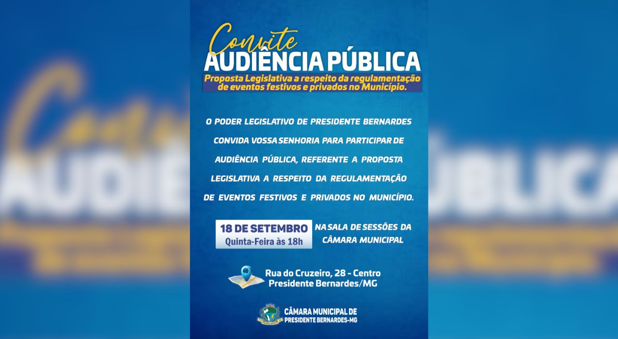 A Câmara Municipal de Presidente Bernardes convida toda a população para participar da Audiência Pública que discutirá a proposta legislativa a respeito da regulamentação de eventos festivos e privados no município.