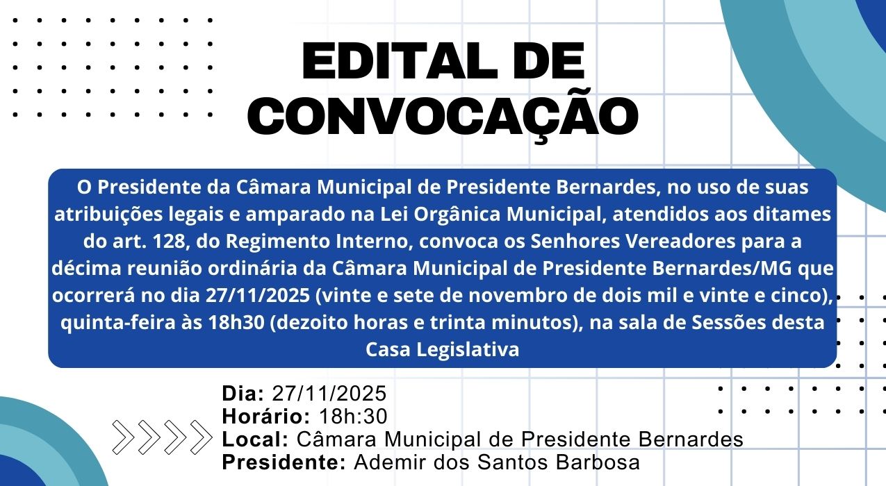 O Presidente da Câmara Municipal de Presidente Bernardes, no uso de suas atribuições legais e amparado na Lei Orgânica Municipal, atendidos aos ditames do art. 128, do Regimento Interno, convoca os Senhores Vereadores para a nona reuniào ordinária da Câmara Municipal de Presidente Bernardes/ MG que ocorrerá no dia 30 / lO I 2025 (trinta de outubro de dois mil e vinte e cinco), quinta-feira às 18h3O (dezoito horas e trinta minutos), na sala de Sessões desta Casa Legislativa, com o seguinte tópico.
